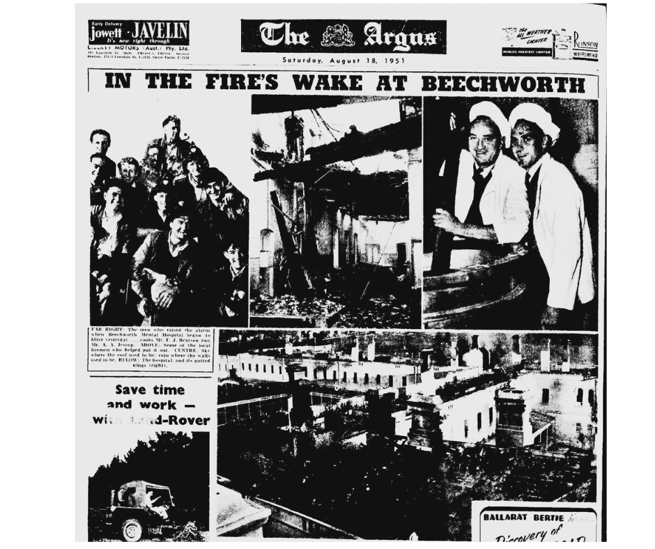 ‘FIRE AT MENTAL HOSPITAL’, Ovens and Murray Advertiser (Beechworth, Vic. : 1855; 1857 – 1890; 1892 – 1955), 18 August 1951 p. 1.